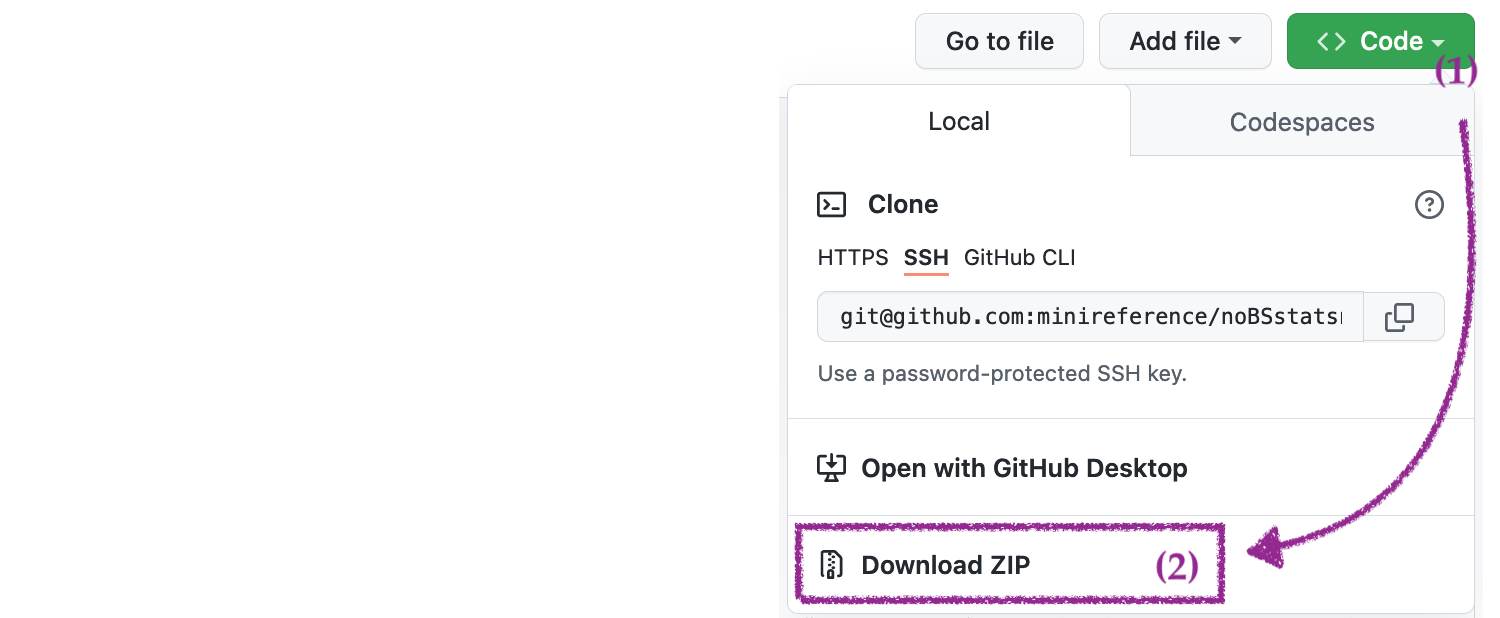 Go to URL https://github.com/minireference/noBSstats and use the Code dropdown button to download the ZIP archive of the entire repository.